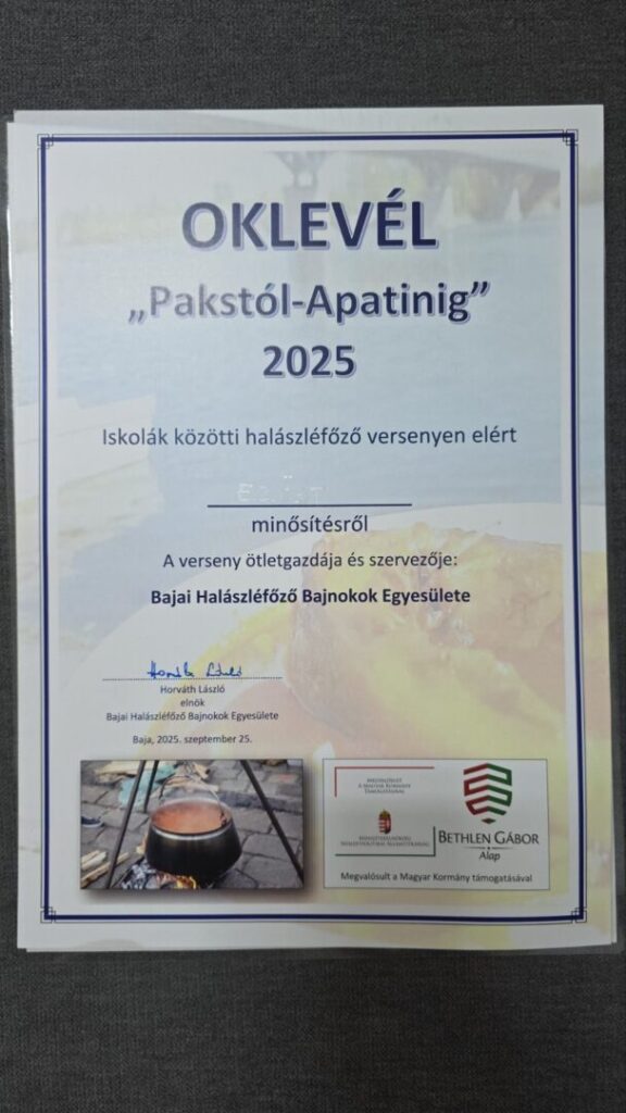 Szeptember 25-én első ízben vett részt a Laskói Általános Iskola csapata a “Pakstól-Apatinig “elnevezésű iskolák közötti halászléfőző versenyen. A versenyen három tanuló, Farahó Tibor, Fekete Zack és Kelemen Noel vettek rész. Elkísérték őket iskolánk szakácsa és az igazgató néni. Valamint magukkal vitték a Kárpát – medence halászléfőző bajnokát is, Munk Eriket. Eriknek köszönjük a sok szívből jövő segítséget, tanulóink sokat tanultak tőle, hogyan készül az igazi bajai halászlé. A verseny célja az volt, hogy a tanulók megismerkedjenek és megtanulják a bajai halászlé elkészítésének a módját, hogy azt világszerte minél többen megismerjék. A csapat az Unatkozó szamarak néven regisztrált, és ezüst minősítést kapott. Gratulálunk nekik!